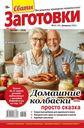 Более 100 рецептов заготовок от Сватов в каждом номере: соленья и маринады, салаты и ассорти, соусы и приправы, заготовки к сезону, сладкие заготовки, напитки, винный погребок, мясные деликатесы, здоровые рецепты, целебные заготовки, дачные хлопоты, правила хранения, а также кроссворды и сканворды для досуга. Лучшими рецептами поделятся с вами сваты Любовь Сергеевна и Михаил Михайлович.